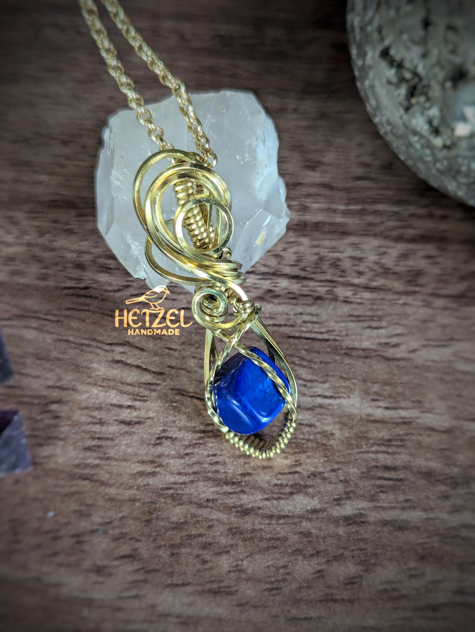This wire wrapped pendant features a vivid natural lapis lazuli suspended in bright brass, framed with graceful swirls and subtle twists. The stone’s rich blues shimmer against the golden metal, inviting wisdom, expression, and inner vision.