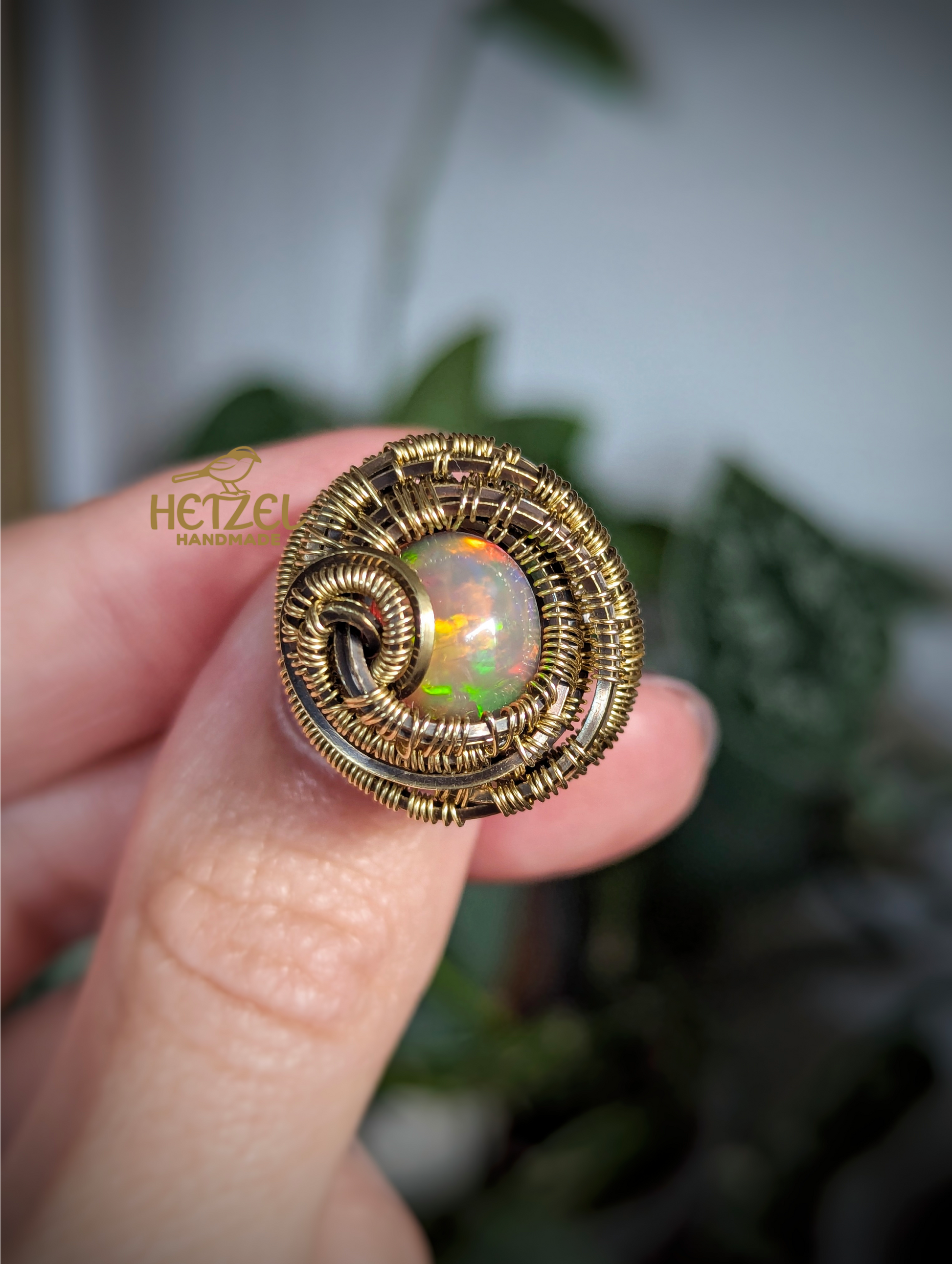 A glowing Ethiopian opal flashes with iridescent color, set within a handwoven swirl of bright and antiqued brass. The design flows with organic rhythm, carrying both elegance and quiet strength.