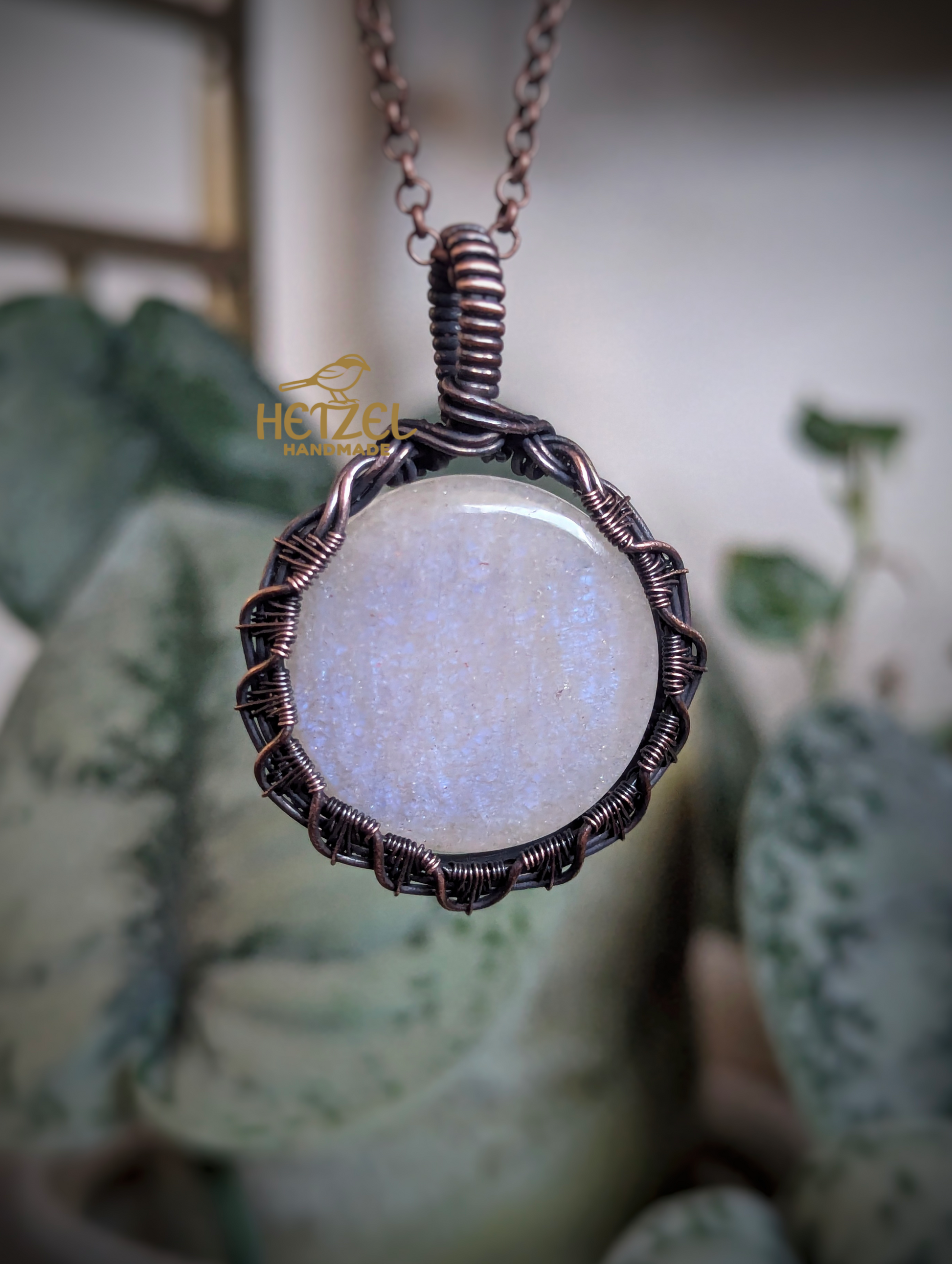 This wire wrapped pendant cradles a luminous moonstone that shimmers with silver and icy blue flashes. Antiqued copper weaves a delicate, twisted frame, echoing a winding trail through shadow and starlight. The design balances timeless elegance with quiet intention.